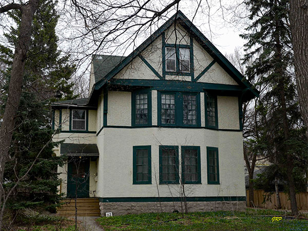 This two-storey structure in the Armstrong’s Point area of Winnipeg was designed by local architect Cyril William Upton Chivers and built by contractor William Wardell Cross in 1909 for grain broker John Geddes. In 1930, alterations were completed by the firm of Borrowman and Jamieson at a cost of about $500.
