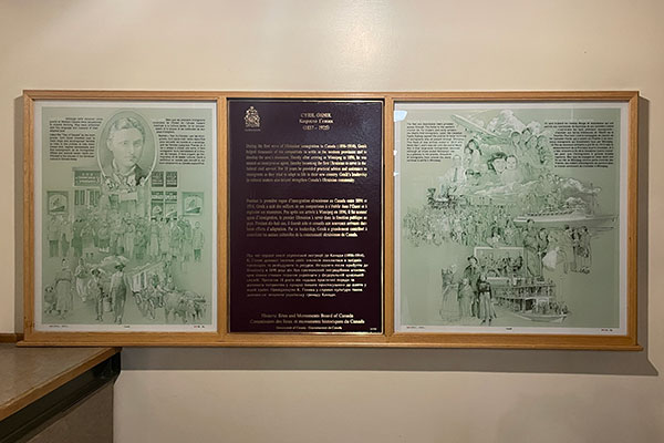 This plaque in the Johnston Terminal Building at The Forks, erected in 1995 by the Historic Sites and Monuments Board of Canada, commemorates immigration agent Cyril Carl Genik. Between 1896 and 1914, Genik helped thousands of Ukrainian immigrants settle in the Canadian West and develop the area’s great resource potential.