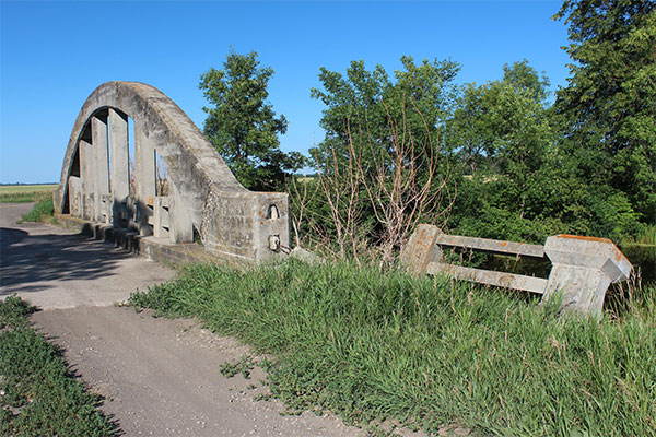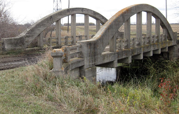 Known locally as “The Rainbow Bridge,” this 50-foot concrete bowstring arch bridge over the La Salle River in the Rural Municipality of Portage la Prairie, near Newton (SE27-11-5W) and the former railway siding of Gervais, was built by William Newman & Company using Plan 367. Construction was completed in October 1919 at a total cost of slightly over $7,000, borne equally by the municipal and provincial governments.