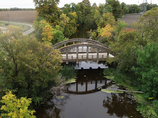 Aerial view of concrete bowstring arch bridge no. 367 over La Salle River (September 2020)