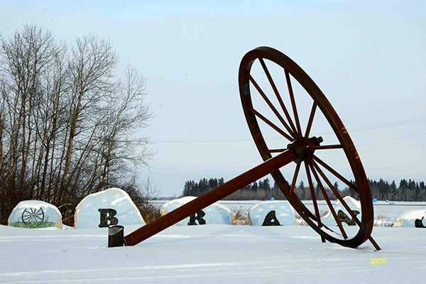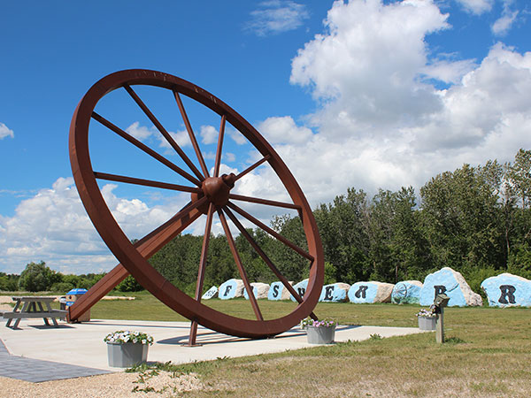 Unveiled at Fisher Branch, in the Rural Municipality of Fisher, in July 2015, this massive wagon wheel—7.6 meters high and weighing 2,800 kilograms—is situated in a public park at the intersection of Highways 233 and 17. Its metal is intended to rust naturally to a rustic colour resembling that of wagon wheels. It symbolizes the historical role of Fisher Branch as the “Hub of the Interlake” during the early 1900s and it is a visual representation of the town’s catchphrase of “A community reinventing the wheel.”