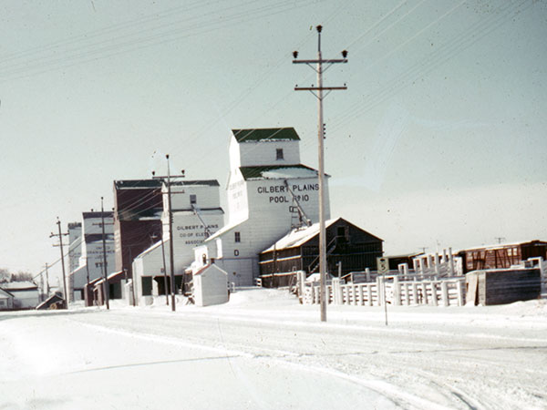 A wooden grain elevator at Gilbert Plains, on the CNR Togo Subdivision in the Municipality of Gibert Plains, was formerly operated by the Manitoba Pool Elevators.