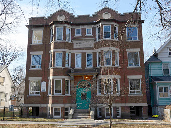 This three-storey brick and stone block on Spence Street in Winnipeg, measuring 46 feet by 80 feet, was designed by local architect William Fingland and built in 1912 by the construction firm of Frid-Lewis at a cost of about $30,000. The building contained 14 apartments in its original configuration.