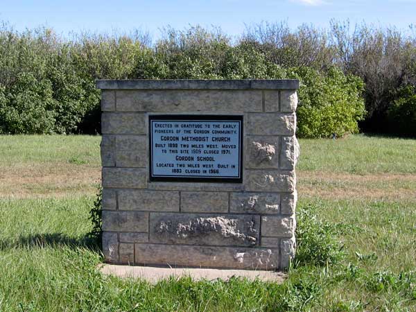 The Gordon Methodist Church was built in 1898, two miles west of the location of this monument in the Municipality of North Cypress-Langford. It was moved to this site in 1909, and closed in 1971. A monument at the site commemorates it, along with Gordon School located two miles west.