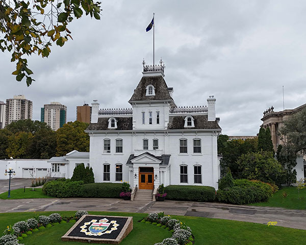 Government House, situated at 10 Kennedy Street adjacent to the Legislative Building, was constructed by local builder Joseph Edmond Gelley under the supervision of architect David Smith starting in September 1882. It was completed in under a year. James Cox Aikins was the first Lieutenant-Governor to take up residence, in September 1883. It was transferred to Manitoba’s jurisdiction in 1885, symbolizing the completion of Manitoba’s parliamentary political structure.