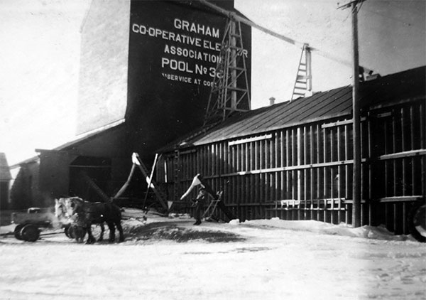 A wooden grain elevator at the railway siding of Graham, on the CPR Carman Subdivision in the Rural Municipality of Roland, was built in 1927 by Manitoba Pool Elevators. Closed in July 1971, the railway was abandoned in November 1975. No vestige of the railway tracks, elevator, agent’s residence, or access roads remain at the site in the middle of an agricultural field.
