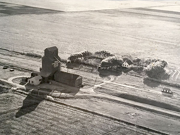 Aerial view of the Manitoba Pool grain elevator and agent’s residence at Graham (no date)