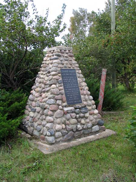 This cairn on the road between Brandon and CFB Shilo, in the Rural Municipality of Cornwallis, was erected on 13 July 1968 by members of the Grand Valley School Memorial Society in memory of pioneers who came by oxcart and steamboat to settle in this area and built the town of Grand Valley. The town’s future was doomed by two disastrous river floods, in 1881 and 1882, and the choice of nearby Brandon as divisional point for the Canadian Pacific Railway.
