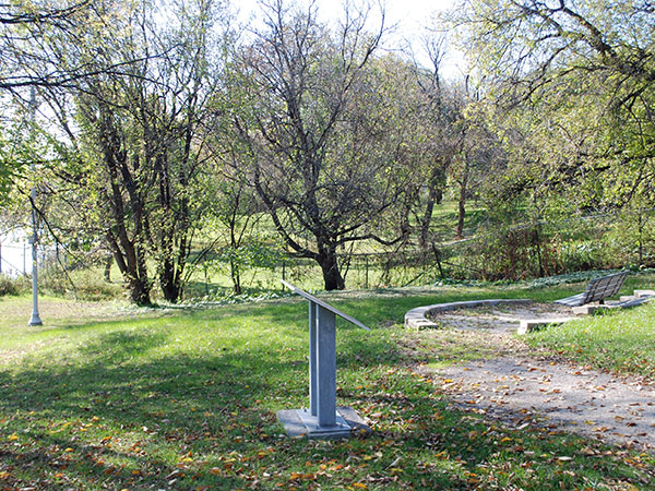The plaza also features a commemorative pole representing the recorded water levels on the Red River during the floods of 1826 (nearly 30 feet above seasonal average), 1950 (23 feet higher higher than seasonal norm), and 1997 floods. A display panel within the park details the a brief history of such milestone floods, highlighting the subsequent raising of Scotia Street, along with protective dikes and pumping stations built along the Red River, to help further protect local citizens from future floods.