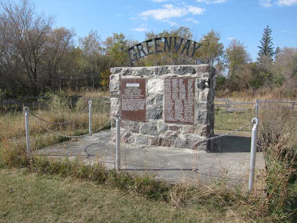 This monument in Greenway, in the Rural Municipality of Argyle, commemorates pioneers of the local area, many of whom are listed on it. Named for early Manitoba politician Thomas Greenway, the village was established in 1890 with the arrival in the area of the Canadian Northern Railway. The monument marks the centre of the now-largely-abandoned village.