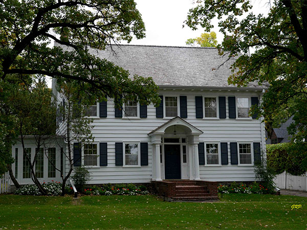 This house in the Tuxedo area of Winnipeg was constructed in 1926 by the local firm of Sparrow Brothers. It follows the Colonial form of the Georgian style using white clapboard and window shutters. The front elevation is true to the balanced proportions of the style.
