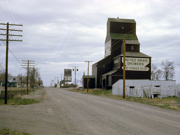 The former United Grain Growers grain elevator 2 at Griswold, with an older 3 elevator in front, both of them obtained from Ogilvie Milling, with the 1 elevator in the background (1966)