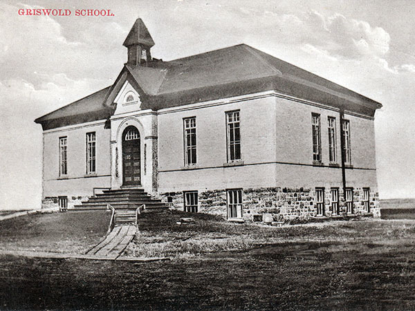 Griswold School District was formally established in September 1885, in Griswold in the Rural Municipality of Sifton. The present brick building dates from 1897, built of a design by Brandon architect W. H. Shillinglaw. In 1959, grades 5-8 of the three-room school were transferred to Oak Lake’s Assiniboine School. It operated as a two-room school until 1968. From 1973 to 1976, the facility hosted only grades 1 to 3 and a private kindergarten class prior to the Fort la Bosse School Division offering the kindergarten option at Assiniboine School. The school closed its doors following the 1975-1976 school year. The building was renovated for use as a community hall. A minute book for the school district, from 1907 to 1943, is held at the S. J. McKee Archives of Brandon University.
