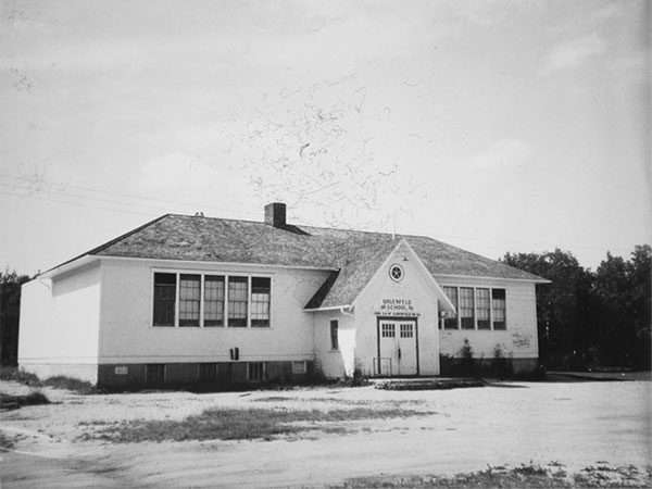 The Gruenfeld School District was organized formally in November 1878 by Mennonite pioneers from Russia. A school building was erected on the northeast quarter of 32-6-5 east of the Principal Meridian in what would later become the Rural Municipality of Hanover. Around 1919, the building was moved to NE29-6-5E and operated there for about ten years when a new one-room building replaced it. The old school was converted into a teacherage. When a new teacherage was built in 1948, the old one was moved to a location about 1.5 miles northeast of the Tourond post office and renovated into a private residence.