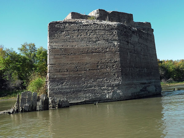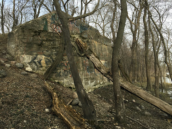 Grand Trunk Pacific railway bridge abutment on the south bank of the Assiniboine River (April 2017)