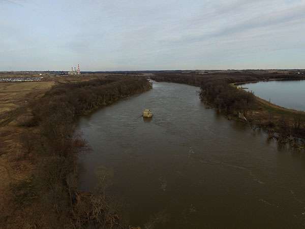 Aerial view of the Grand Trunk Pacific railway bridge pier in the centre of the Assiniboine River (April 2017)
