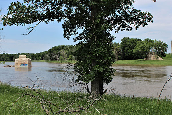 Aerial view of the Grand Trunk Pacific railway bridge pier in the centre of the Assiniboine River (June 2018)