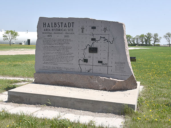 A stone monument beside the Halbstadt Community Centre in the Municipality of Rhineland includes a map showing local historic sites: North Houston School No. 214 (1942-1964), Blumenthal Cemetery, South Houston School No. 214 (1884-1964), Halbstadt Post Office and Store (1905-2000), Halbstadt Credit Union (1961-2000), Halbstadt Blacksmith Shop, Halbstadt School No. 886 (1896-1964), Halbstadt Church and Cemetery, and Strassberg School No. 757 (1893-1967).
