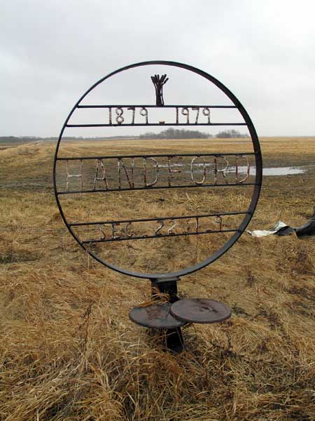 A monument in the Municipality of Pembina commemorates the Handford family who homesteaded section 22 of township 1, range 9 west of the Principal Meridian.