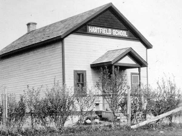 The Hartfield School District was established in December 1909 and a one-room schoolhouse operated at SE1-22-6W in what is now the Municipality of West Interlake. The school closed in 1967 and the district was dissolved. Its catchment area became part of the Lakeshore School Division. The former school building was sold to a local resident. Only the concrete foundation remained at the time of a 2014 site visit.