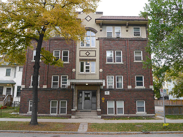 This three-storey concrete, brick and stone apartment block on Furby Street in Winnipeg was designed by architect James William Hawker and built in 1929 by the Moxam Construction Company at a cost of about $75,000. The 50 feet by 124 feet structure contained 22 suites of two or three rooms, with six on each floor and four in the basement.
