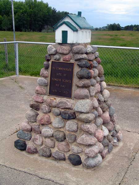 The Hawkins School District was organized formally in March 1891 and a school building was constructed in the northeast quarter of 12-7-15 west of the Principal Meridian in what is now the Municipality of Glenboro-South Cypress. The school closed in 1956, after which students were bused to Glenboro Consolidated School No. 2367. The district was dissolved in January 1959. A fieldstone monument was erected on the former school site.