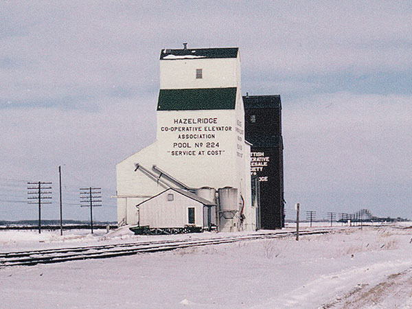 A 30,000-bushel wooden grain elevator at Hazelridge, on the CPR Keewatin Subdivision in the Rural Municipality of Springfield, was built in 1936 by the Scottish Co-operative Wholesale Society. Sold to Manitoba Pool Elevators in 1973, the two elevators were operated together for a time. It was demolished in 1975.