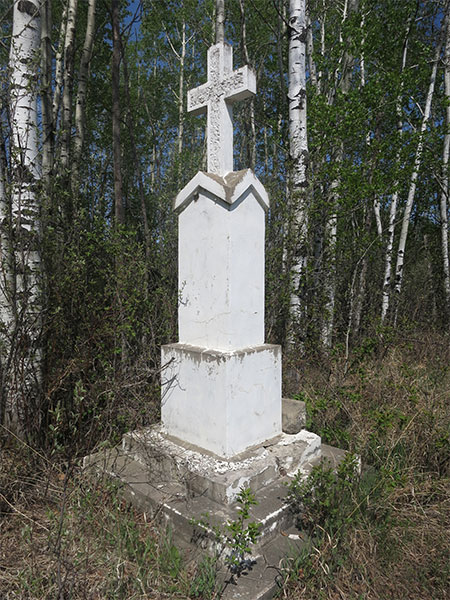 A simple cross made of concrete is situated in the former Rural Municipality of Hillsburg, now the Municipality of Roblin. Its maker and function are presently unknown.