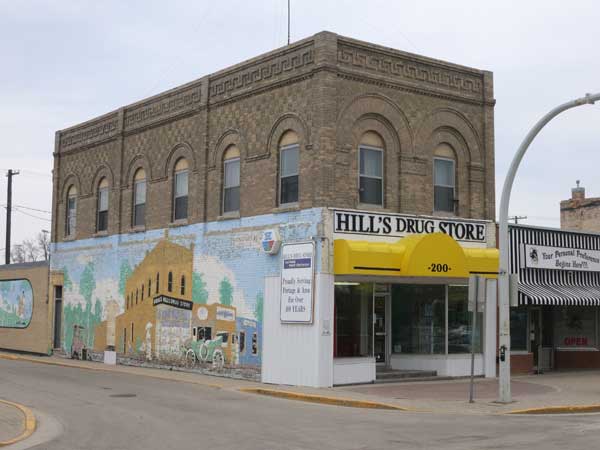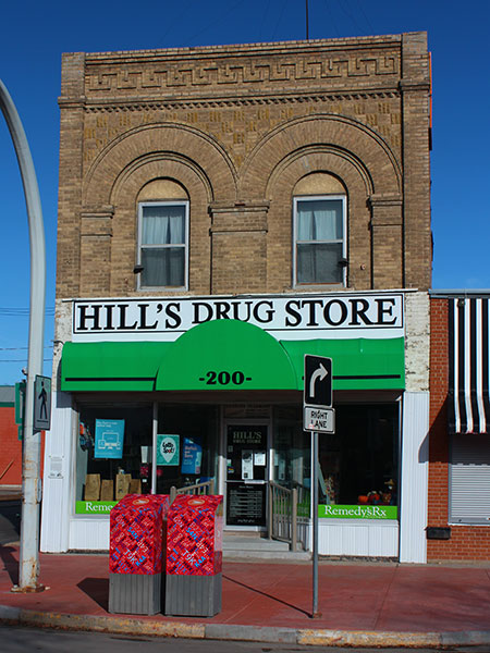 In 1901, pharmacist John Kelly Hill built a two-storey brick building at this site on Saskatchewan Avenue East in Portage la Prairie using locally-produced bricks. Son George Kelly Hill (1904-1980) joined the business in 1927. He sold the building in 1976 to Delta Apparel Industries and the business to pharmacists Cliff Bagrie and Charlie Oliver. The building and pharmacy were purchased by subsequent owners in 2006.