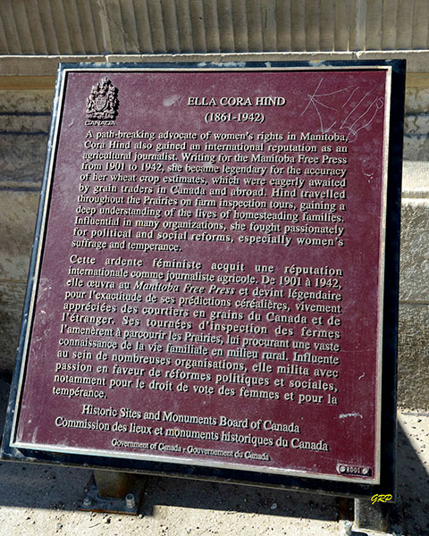 This plaque by the Historic Sites and Monuments Board of Canada was erected in 1997 by the Free Press Building on Carlton Street, where Hind worked for many years.