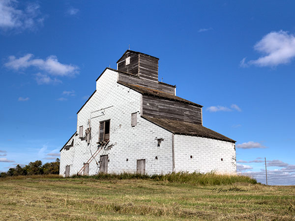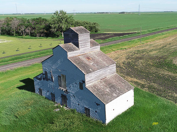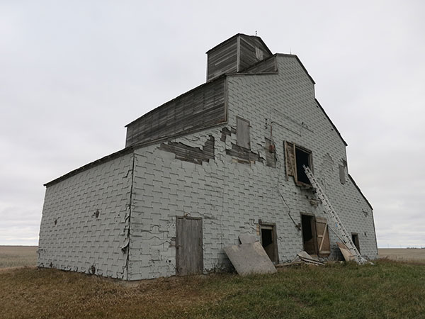 Built in 1945 for farmer Ernest William Hoffman (1892-1972) as a make-work project for Japanese detainees sent inland from British Columbia during the Second World War, this small grain elevator and grist mill near Brunkild in the Rural Municipality of Macdonald featured a plaque written in Japanese that gave Hoffman’s initials and the symbol for “prosperity.” After sitting unused for many years, the building was sold around 1969. The new owner covered it with asphalt shingles, removed its leg, and filled the pit with concrete. Some interior wooden walls and floors were removed so much of the first two floors could used as a granary. The plaque was given to Hoffman’s descendants. Some of the mill machinery near the top of the now-unused structure was still intact at the time of a 2018 site visit.