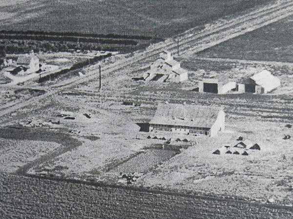 Aerial view of the Hoffman family farm including the grain elevator and mill at the centre rear (no date)