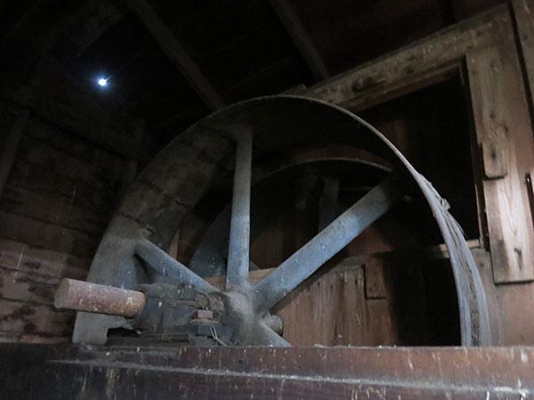 Grist mill machinery inside the Hoffman family grain elevator and mill (October 2018)