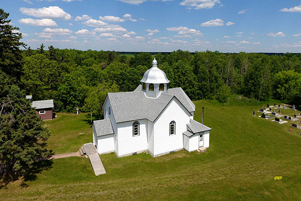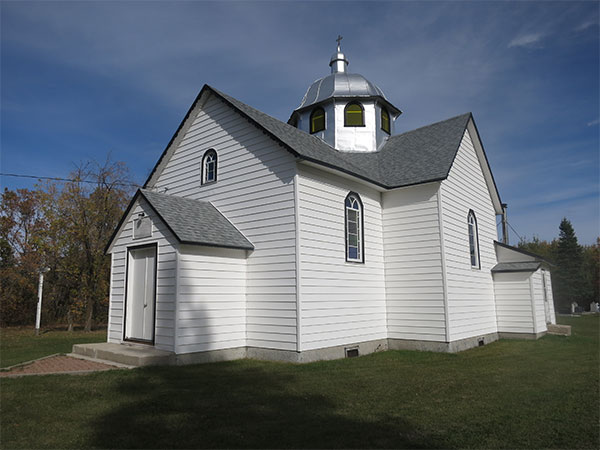 Construction of this small church in Elma in the Rural Municipality of Whitemouth took place between 1909 and 1912, replacing an earlier Ukrainian church and cemetery built before the arrival of the railway in 1908. In 1921, the interior of the building’s dome and walls were painted with religious iconography and murals by Winnipeg artist Hnat Sych, whose work can be seen in churches throughout Manitoba and Saskatchewan, and it was renewed by V. Pushka in 1955. The church still holds monthly services and maintains a small cemetery, the first burial in which occurred in 1909.