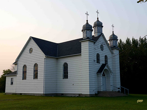 This Ukrainian Catholic church near Benito, in the Municipality of Swan Valley West, in the second building at the site. The first church was destroyed by fire in 1974 and this structure, built between 1942 and 1948, was moved here from Stornoway, Saskatchewan.