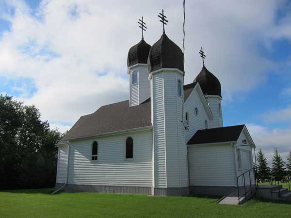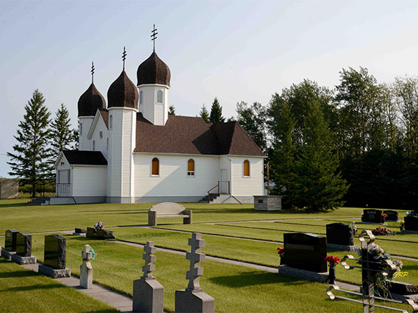 This Ukrainian Orthodox church and cemetery at Lennard, in the Rural Municipality of Riding Mountain West, was constructed in 1932. Vera Senchuk completed its iconography in 1984.