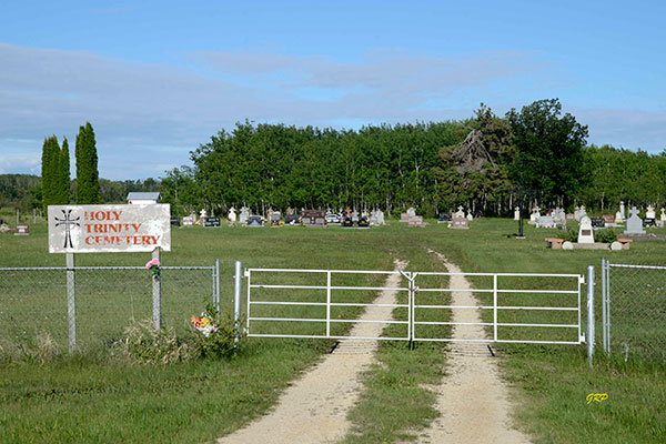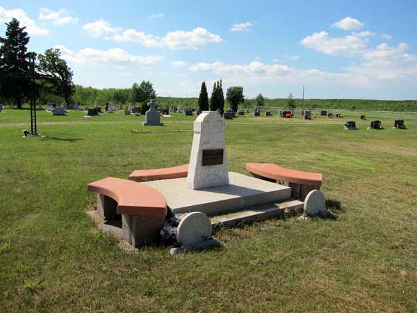 This cemetery in the Rural Municipality of Armstrong is affiliated with a Ukrainian Catholic Church in the nearby village of Komarno. A monument in it commemorates the many pioneers who arrived from Ukraine at the beginning of the 20th century. In 1906, they registered a post office near this site, using the name Komarno. (One story says the name derived from the region of Ukraine from which the settlers came. Another is that the word means “too many mosquitoes” in Ukrainian.) The arrival of a railway in the area the next year, and construction of a highway in 1918-1919, resulted in expansion of the settlement. The first school was built in 1909.