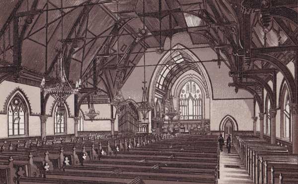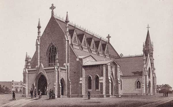 Erected in 1883-1884 on the north side of Graham Avenue between Donald and Smith streets in Winnipeg, to the designs of local architect Charles H. Wheeler, this picturesque limestone structure is a fine example of the High Victorian Gothic style. It displays a creative interpretation of the cruciform plan and a lively use of motifs such as dormer clerestory windows, buttresses, finials and hammer beam ceiling. The irregular outline, with attached parish hall and bell tower, recalls English parish churches. This church is the fourth to serve the parish since its incorporation in 1868. Set within a landscaped churchyard, Holy Trinity is a landmark in the heart of Winnipeg and a municipally-designated historic site. In 1990, a commemorative plaque was erected on its grounds by the Historic Sites and Monuments Board of Canada.