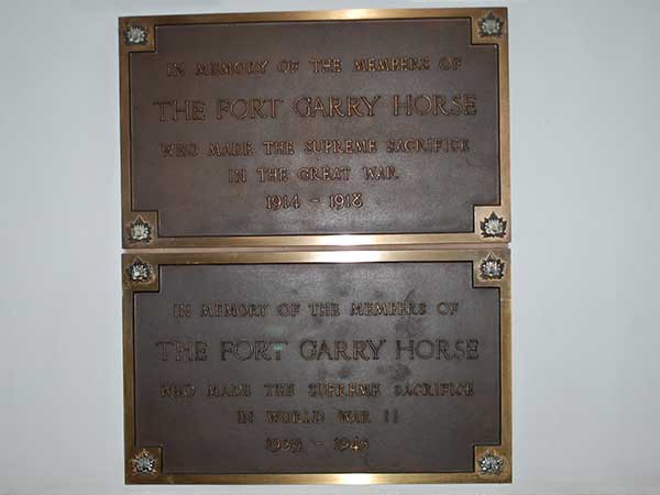 Located on the interior south wall of the sanctuary are two bronze plaques commemorating the members of the Fort Garry Horse (FGH) who died in service of their country during the First and Second World Wars. The plaques were unveiled on 22 June 1947 by Lieutenant Colonel R. F. Bingham (former FGH Commanding Officer) and dedicated by Reverend C. C. Carruthers (former FGH Chaplain and Major). Also present at the event was Brigadier M. H. S. Pendale and Brigadier R. O. G. Morton. A tribute parade was performed by members of the Fort Garry Horse Association 10th Armoured Regiment, along with cadets and the regiments’ band.