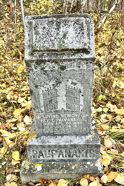 Gravestone of Rev. Edward Paupenakis in the Hudson’s Bay Company Cemetery (October 2023)