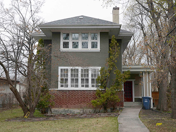This two-storey brick and stone house on Yale Avenue, in the Crescentwood area of Winnipeg, was designed by local architect John Danley Atchison and built in 1923 by Halldor Sigurdsson for physician Charles A. Hunter.