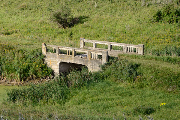 Construction of this concrete culvert bridge over the Scallion Creek along an abandoned portion of highway 256 (E4-11-28W) in what is now the Rural Municipality of Wallace-Woodworth was completed in September 1916, by contractors A. Munro and William Newman & Company using Plan 64, at a cost of $1,165.