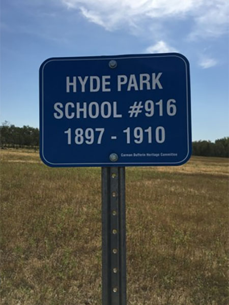 The Hyde Park School District was established in October 1897 and a log school building was constructed at NW3-7-7W in the Rural Municipality of Dufferin. It closed in 1910 and its catchment area was consolidated with Roseisle School District the following year. No vestige of the school remains at the site but a commemorative sign was installed by the Carman/Dufferin Municipal Heritage Advisory Committee.