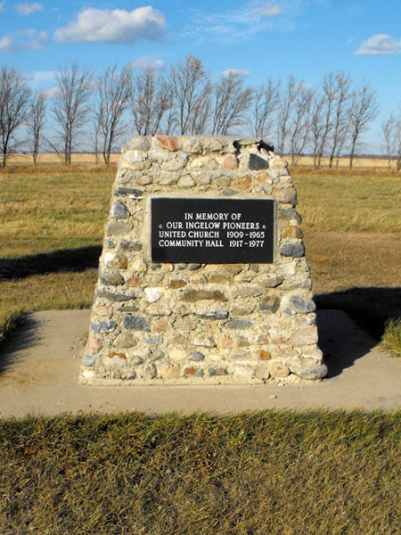 A monument in the Municipality of North Cypress-Langford, unveiled at a ceremony on 21 October 1979, commemorates the hamlet of Ingelow and the United Church situated here from 1909 to 1965, and Community Hall from 1917 to 1977. After closure of the church, parishioners joined congregations at Douglas or Brookdale. The Community Hall, formerly Harburn School No. 1313 (1904-1915), was moved to this location in 1917 from the southeast corner of 14-12-16W. Its contents were sold at auction in 1978 and the building was demolished.
