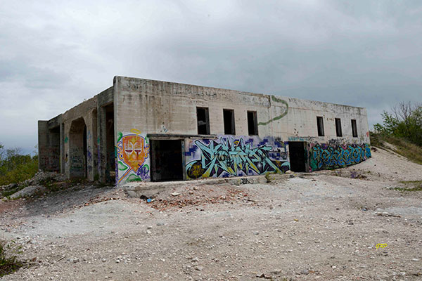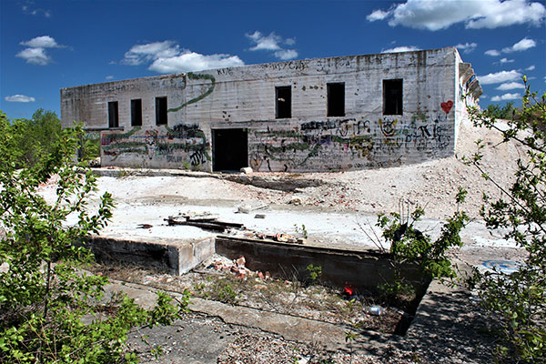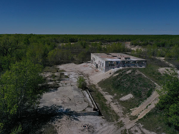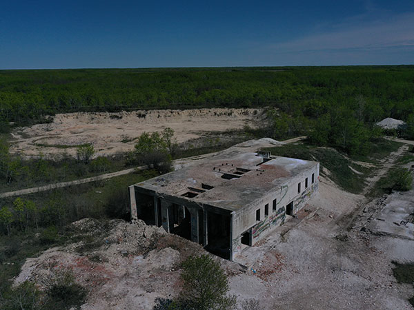 The site near Inwood, in the Rural Municipality of Armstrong, has several large, irregular pits around an abandoned two-storey concrete building. Liberally festooned with graffiti, its ceiling has been blackened as a result of a large fire. The facility was established and operated by a company known as Building Products and Coal Limited, founded at Winnipeg in 1919, that manufactured lime for the construction industry.