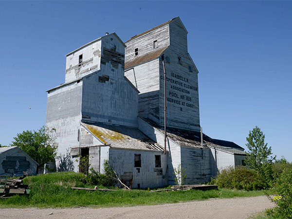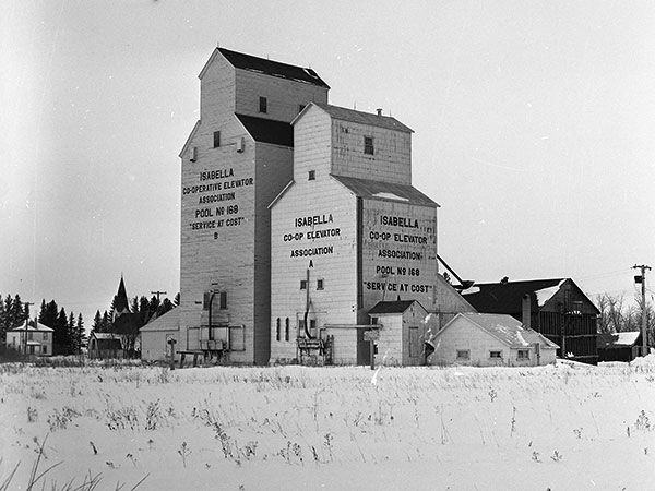 Two wooden grain elevators stand at Isabella, on the former CNR Rapid City Subdivision in what is now the Municipality of Prairie View. The shorter of them was built by the Western Canada Flour Milling Company at Crandall and was dismantled and reassembled at Isabella in 1910. It was sold to Manitoba Pool Elevators in 1939. The taller elevator was built beside the smaller one by Manitoba Pool in 1955. A third elevator at Isabella was constructed in 1913 by the Grain Growers’ Grain Company (later United Grain Growers), probably replacing an earlier elevator, and operated by the company until 1962 when it was traded to Manitoba Pool. The elevator was demolished in 1978.