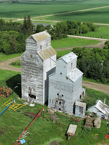 Aerial view of the former Manitoba Pool grain elevators at Isabella (July 2022)