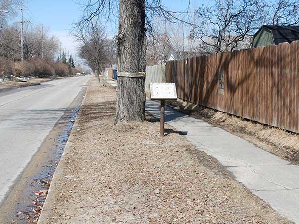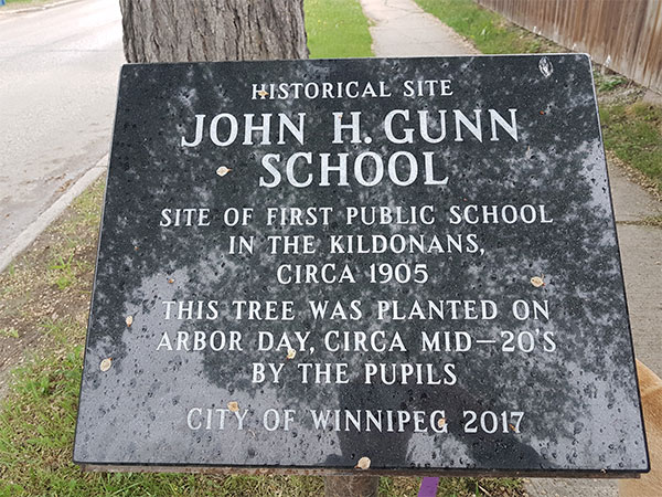 Opened on 19 September 1910 on two acres of land on the north side of Kildonan Avenue (now Kingsbury Avenue), west of the CPR tracks, John H. Gunn School was named for municipal official John H. Gunn. Initially a one-classroom, wood frame structure, in 1912 a second classroom was added with a hallway between them where overflow classes were sometimes held. The school closed in June 1935 and, two years later, the building was sold to a W. Weller for use as a mill. There is no vestige of the building at the site, which now supports residential development. On a road boulevard near the former school is an elm tree, named the “John H. Gunn School Elm,” that was planted by the school on Arbor Day in 1925. A nearby plaque was installed in 1985 by the Subcommittee on Parks and Boulevards. It was missing at the time of a 2014 site visit but was replaced in 2017.