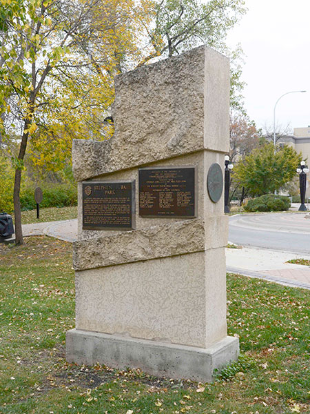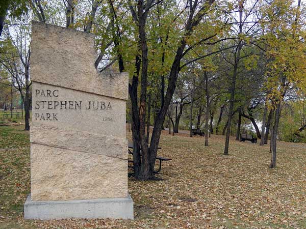 Stephen Juba Park was dedicated in recognition of Juba’s leadership in making this park a reality. Located between the Red River and Waterfront Drive from the foot of Lombard Avenue to the foot of James Avenue, a commemorative monument, unveiled on 14 October 1983 by Governor General Ed Schreyer, is located approximately mid-way through the Park at the foot of Bannatyne Avenue. A plaque mounted on the side of the monument lists the names of dignitaries attending the ceremony, and members of the Winnipeg City Council at that time.