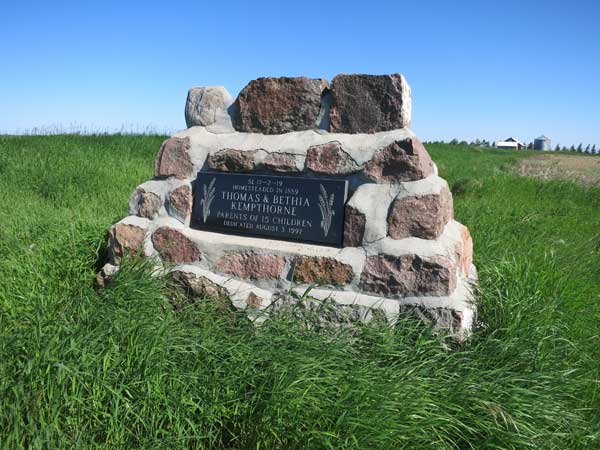 This monument in the Municipality of Boissevain-Morton, dedicated on 3 August 1997, commemorates Thomas and Bethia Kempthorne, and their 15 children, who homesteaded SE17-2-19W in 1889.